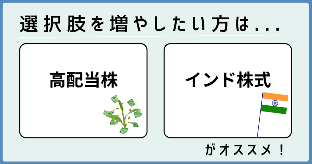 高配当株は定期的な収入を得たい方、インド株式は長期的な成長を狙う方に適しています。